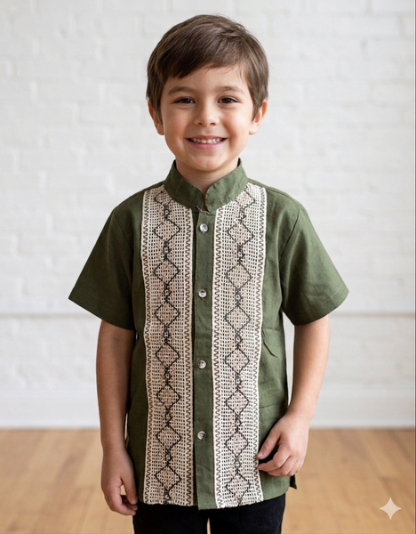 Turn heads up with our fine Boys Guayabera made with cotton manta fabric and accented with multicolor fabric, buttoned.