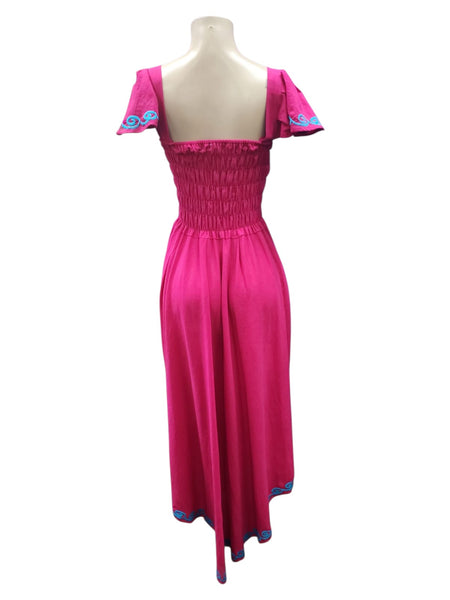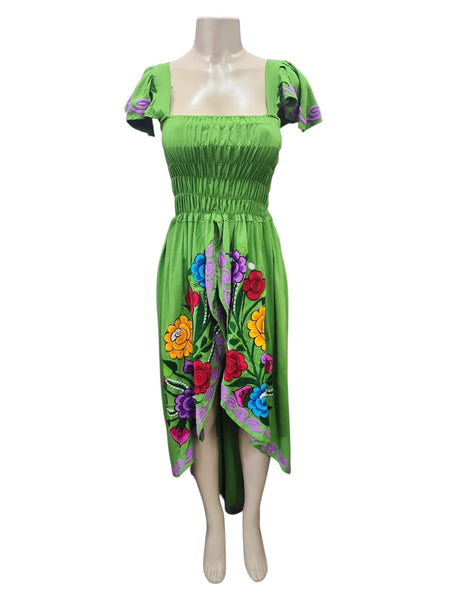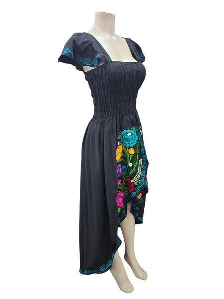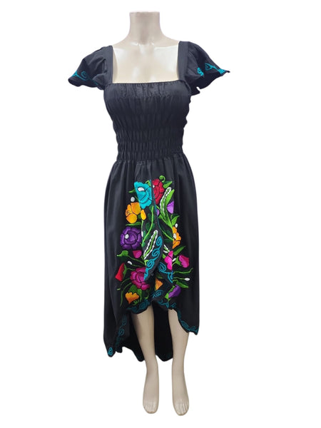 Made from soft cotton, the Gisela Dress features exquisite vibrant floral embroidery from Zincacantan, Chiapas. Its flattering stretch fit shapes the body from chest to waist, enhanced by charming ruffle sleeves and a petal-style hem that elegantly opens at the center. This dress fits small to medium sizes with ease and can also accommodate some larger sizes with a smaller bust.