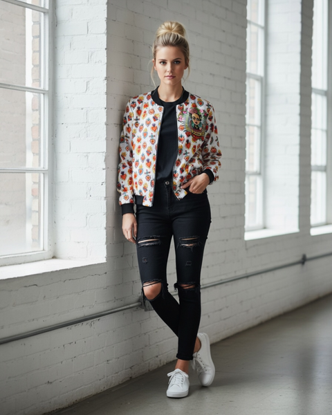 The Frida Sacted Hearts Bomber Jacket combines a vibrant, colorful design with a comfortable, stretchable fabric. Its fitted style not only looks stylish but also allows for ease of movement, making it perfect for any casual outing. Embrace your unique style with this eye-catching addition to your wardrobe!