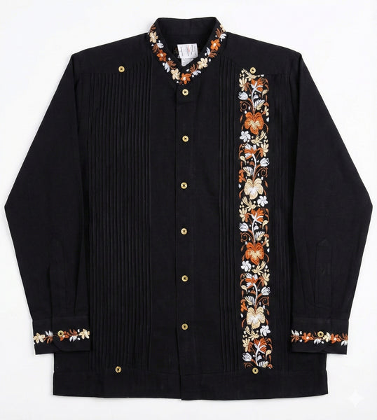 High quality men’s Guayabera made with black fresh linen and beautifully embroidered featuring a Mayan pattern.