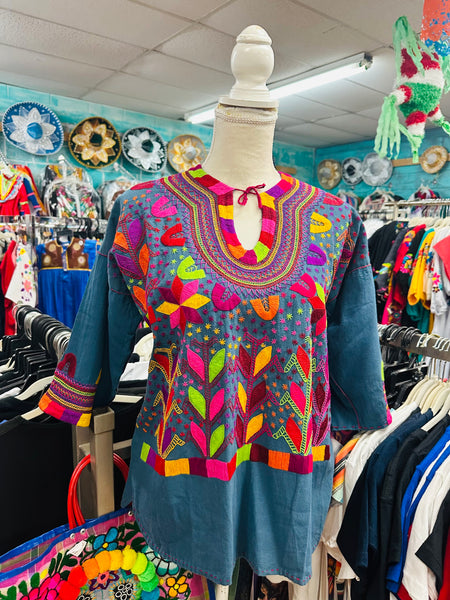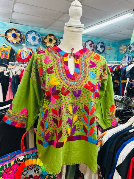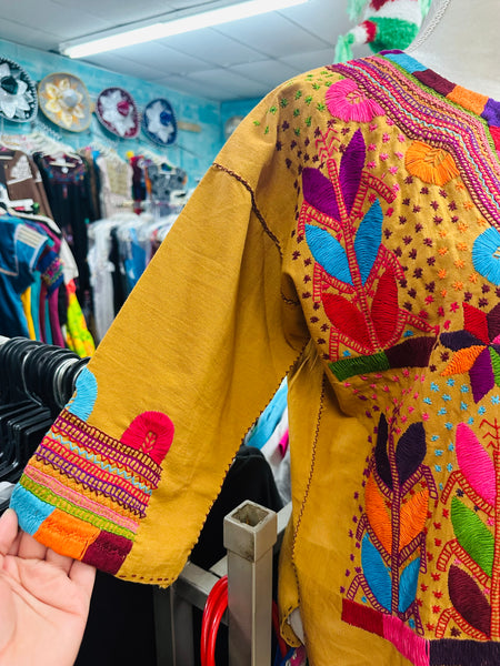 One of a kind! New top hand stitched 100% by hand. Magenta color fabric and beige Milpa embroidery. Very mid sleeves, v-neck with tassels.