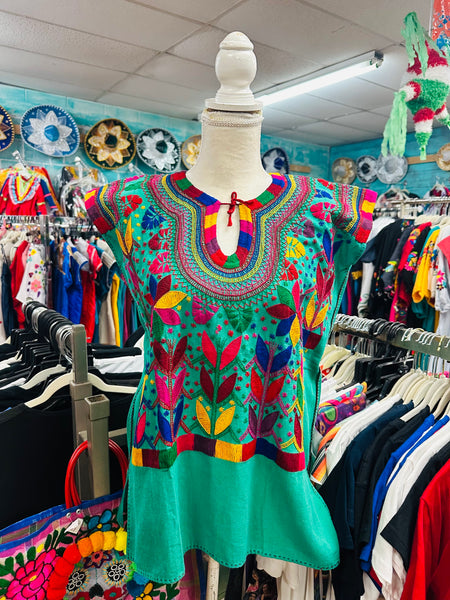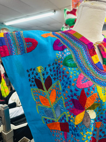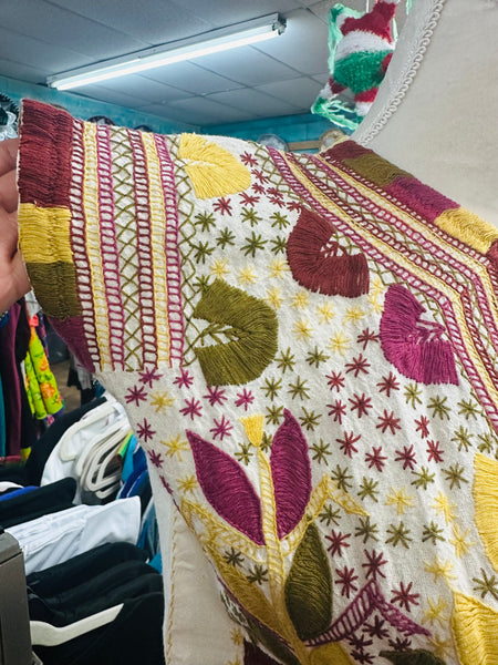 One of a kind! New top hand stitched 100% by hand. Magenta color fabric and beige Milpa embroidery. Very short sleeves, v-neck with tassels.